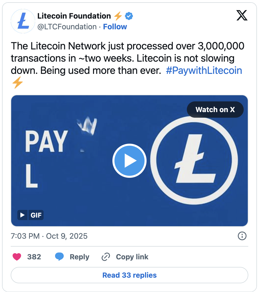 莱特币基金会数据显示,过去两周网络交易量突破300万笔。链上数据表明大额钱包持仓增长15%,单日交易额超20亿美元。这些指标暗示机构投资者正重新青睐LTC。分析师指出,市场预期美国政府停摆结束后,美国证券交易委员会(SEC)可能批准现货莱特币ETF,这推动了价格上涨。
