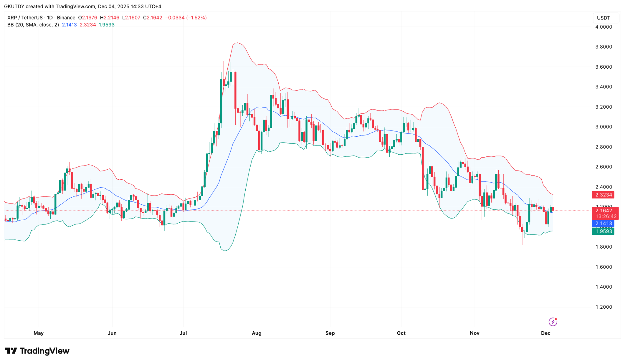 • 布林带指标显示XRP突破2.20美元并非多头陷阱