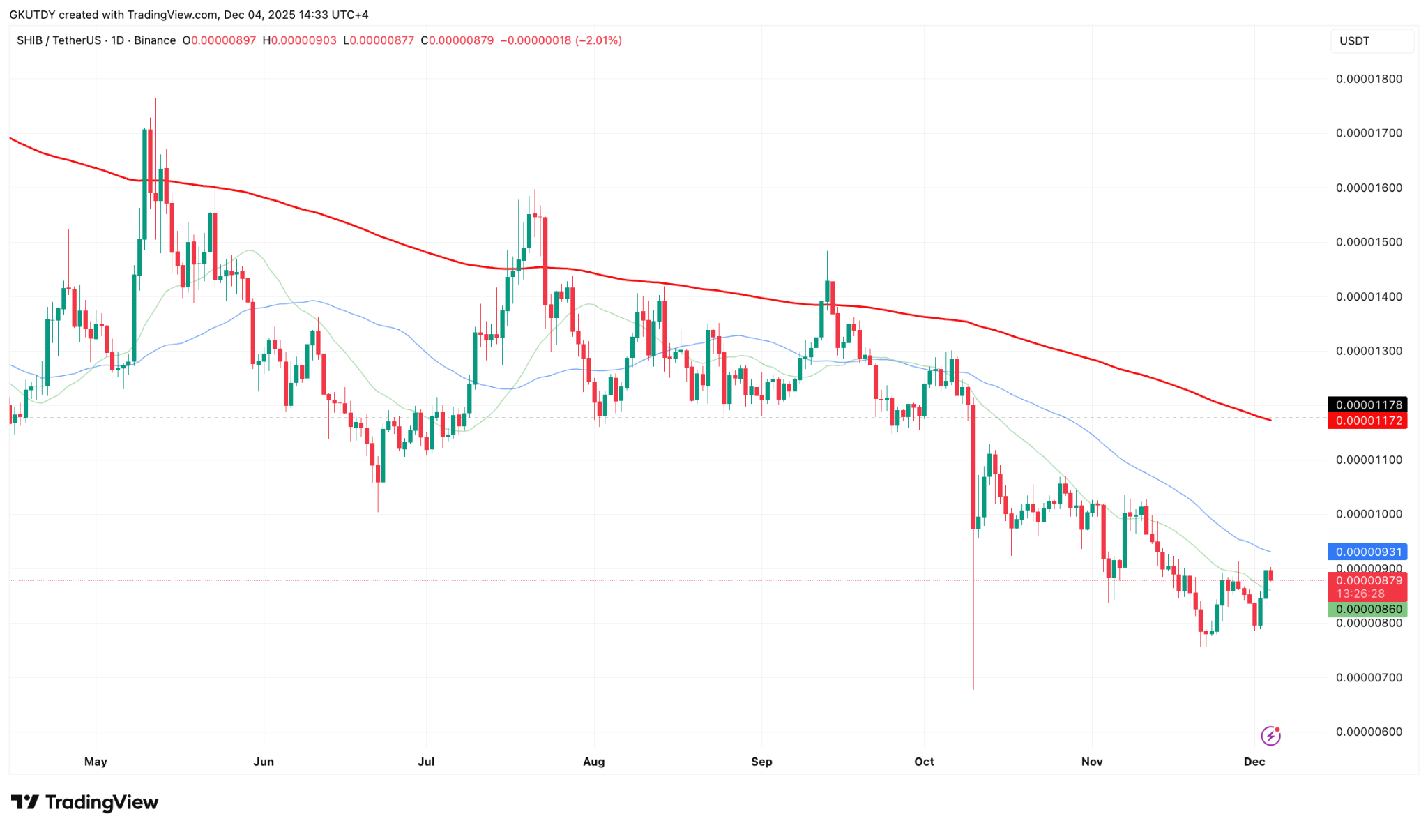 SHIB在12月初展现出与持续数月的疲软叙事背离的技术结构。经历10月末至11月的下行后,该资产在11日内累计上涨12%,并首次构筑起具有持续性的价格基底。日内收盘价站稳0.00000899美元,突破持续整月的阻力天花板。目前SHIB在0.00000863-0.00000934美元区间震荡,该区域将决定资产能否从反弹转为趋势性上涨。