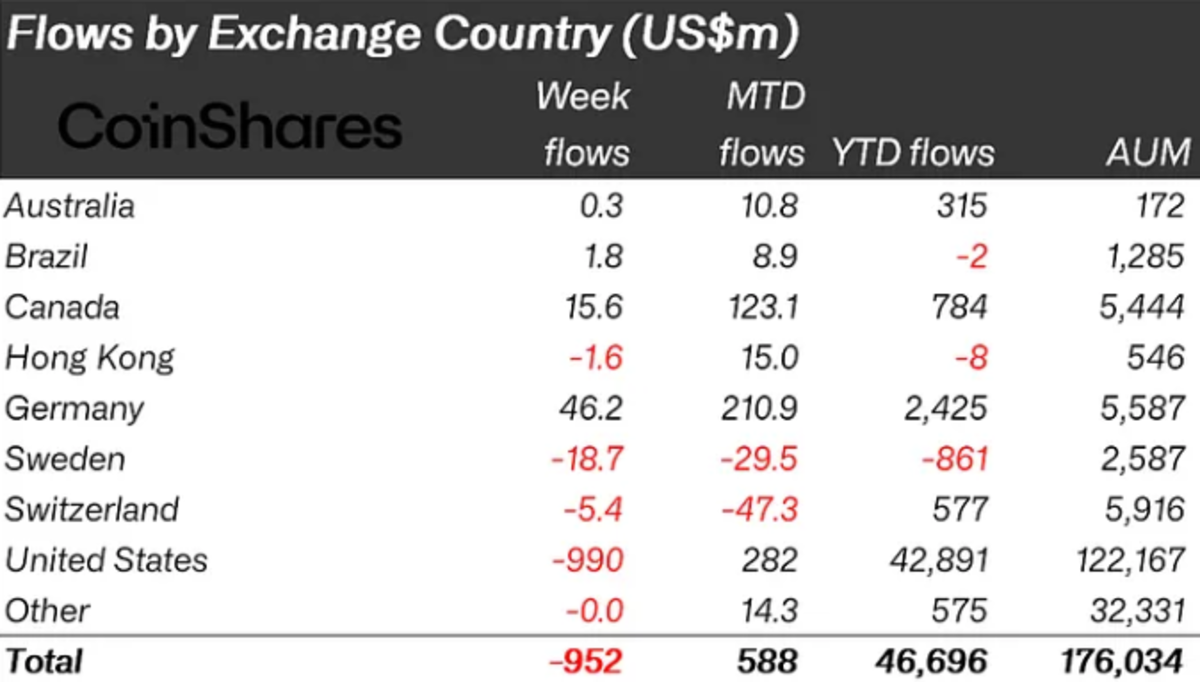 美国地区以9.9亿美元外流居首,但加拿大和德国的资金流入部分抵消了这一数据。