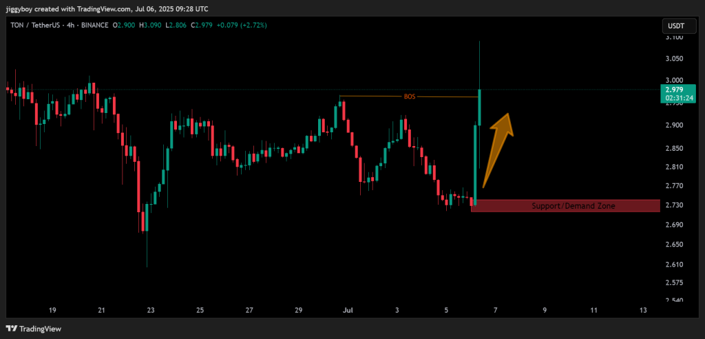 4小时图表显示Toncoin实现强势技术突破。过去两周价格始终在2.73至2.95美元区间盘整。7月5日TON下探至2.73美元关键需求区后快速反弹,形成突破2.90美元阻力位的大阳线,确认了看涨结构突破(BOS)。