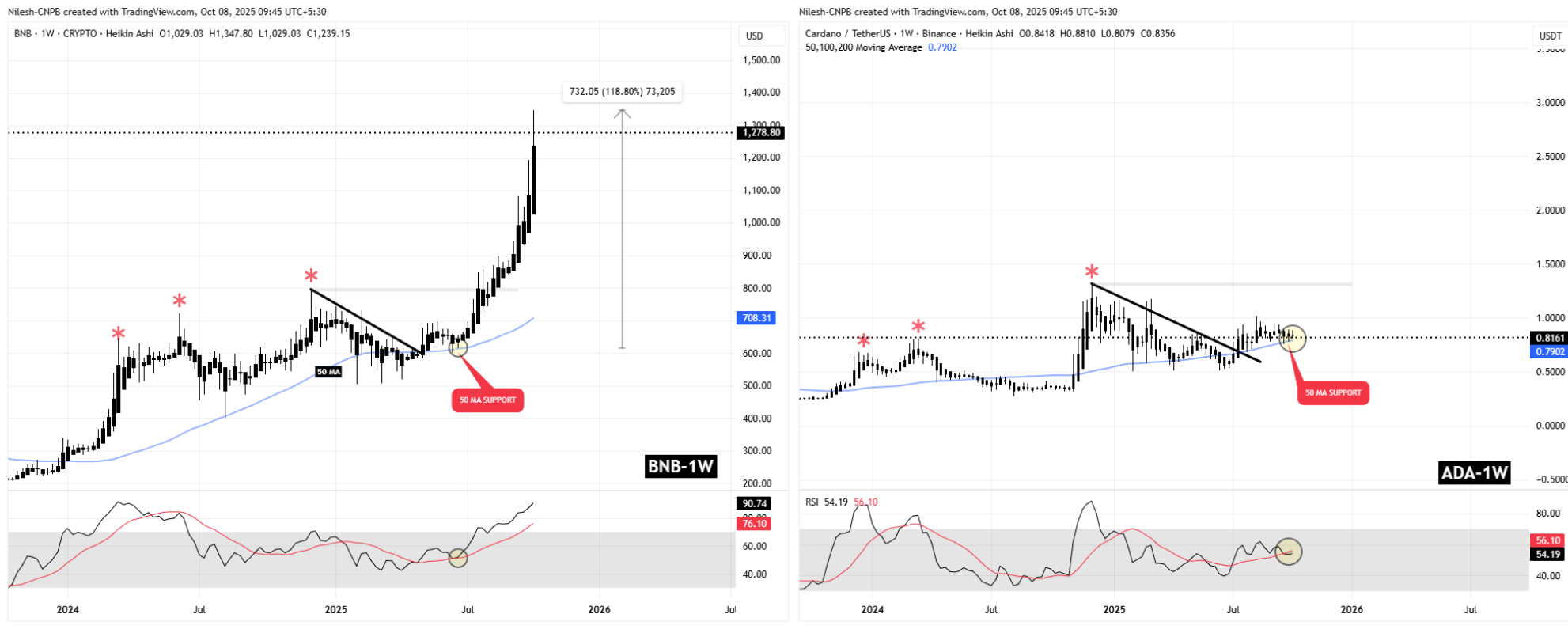 周线图显示,ADA与BNB的走势存在惊人相似性,两者均遵循可比的分形结构。2025年5月初,BNB突破下降趋势线后大幅上涨,随后回踩50周均线(MA)作为支撑。这次回踩引发强劲反弹——推动币价从回踩点累计上涨超118%。
