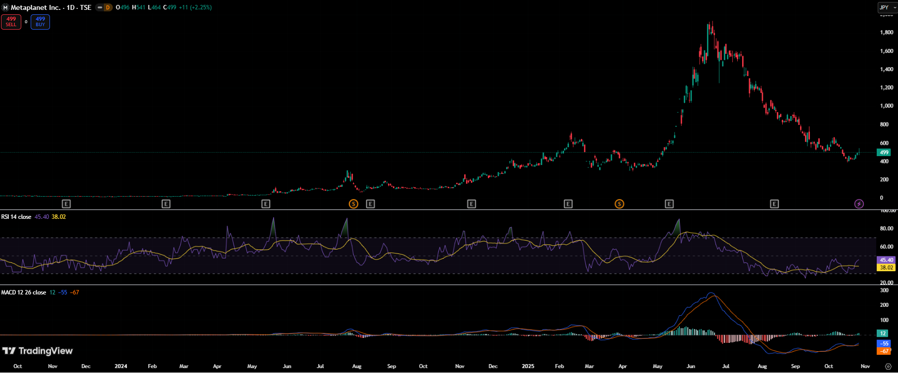 Metaplanet股价周二攀升至519日元,随后出现温和获利回吐,盘中交易价格在464至541日元之间。成交量激增至7500万股以上,远超平均4900万股。活动的激增凸显了市场对该公司比特币驱动的商业模式的信心。