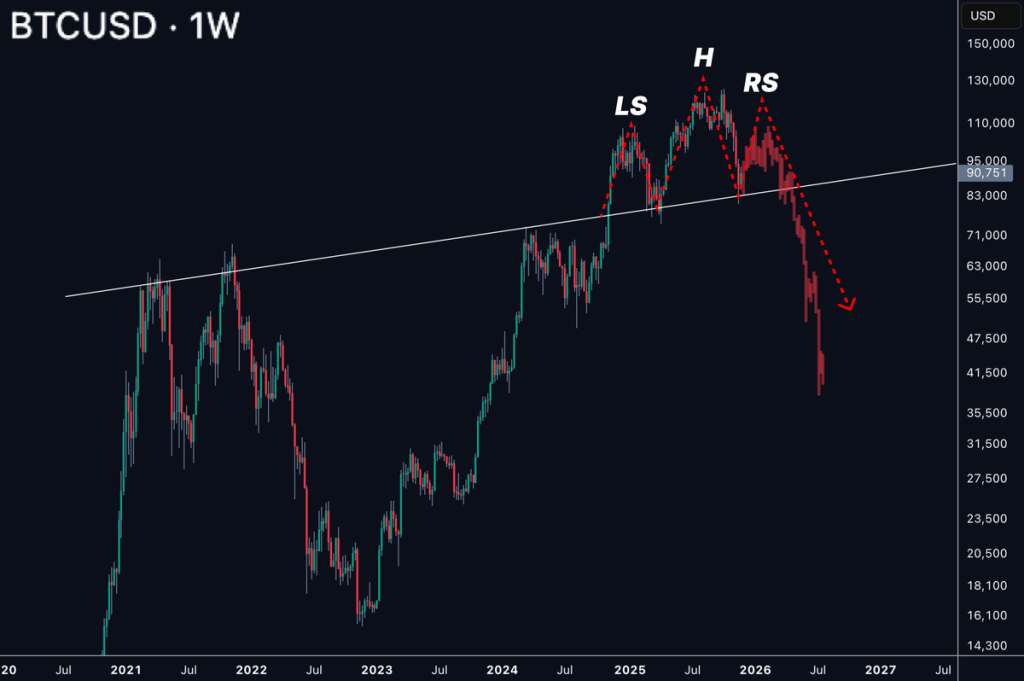 这份比特币图表呈现出一个庞大且轮廓清晰的头肩顶结构:
