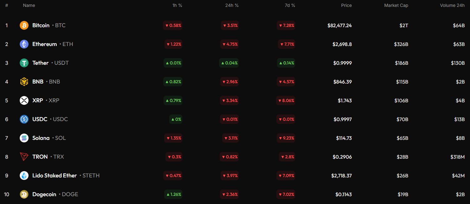 本周结束时,十大加密货币均处于下跌区间,据CoinStats数据显示。