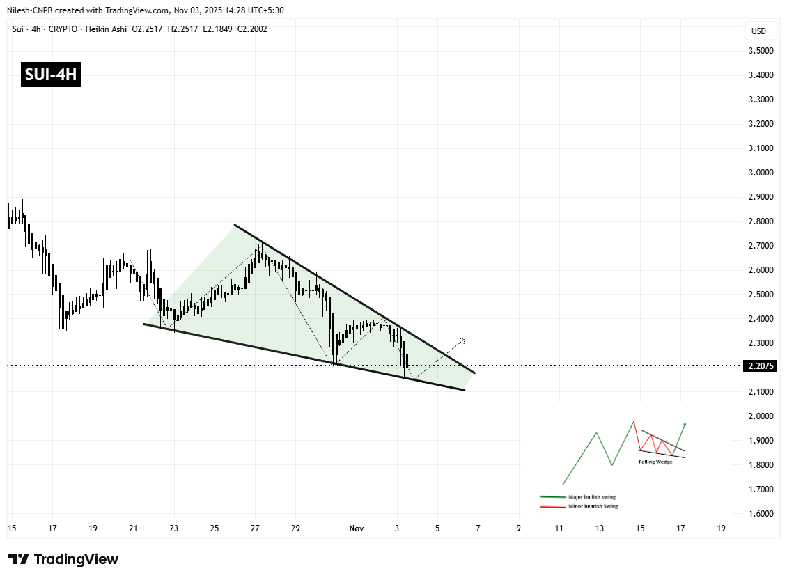 从4小时图来看,SUI正在形成典型的下降楔形形态,这通常是预示下跌趋势终结的看涨反转形态。如图所示,自10月下旬以来,该代币价格一直在收敛趋势线内稳步下跌,最近的回调使其正好触及楔形下轨支撑位2.20美元附近。该水平在近期交易中多次吸引买盘,表明多头正在积极防守这一区域。