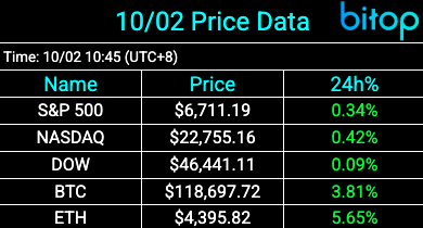 尽管美国政府已正式停摆,但标普500指数周三仍以历史新高收盘,首次站上6700点关口。加密货币市场上涨3.81%,总市值重返4万亿美元里程碑。比特币(BTC)收复118K大关,以太坊(ETH)亦暴涨近5%,而恐惧与贪婪指数维持在42的中性水平。