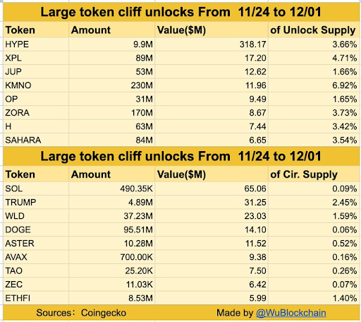 根据11月24日至12月1日的安排,多个加密货币项目计划解锁代币总额超5.66亿美元。Coingecko数据显示,此次活动包括一次性悬崖解锁和每日线性释放。HYPE、SOL、KMNO和TRUMP的解锁价值在此期间位居前列。