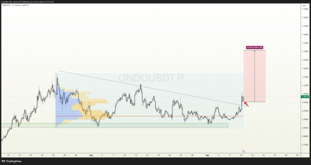 观察4小时图表可见,ONDO价格已明确突破下降三角形形态——这个压制价格长达一个月的关键形态。更具说服力的是,价格不仅突破阻力位,还成功回踩测试了关键支撑/阻力区域并保持坚挺。突破时伴随的成交量放大进一步强化了看涨逻辑,表明资金正在回流。