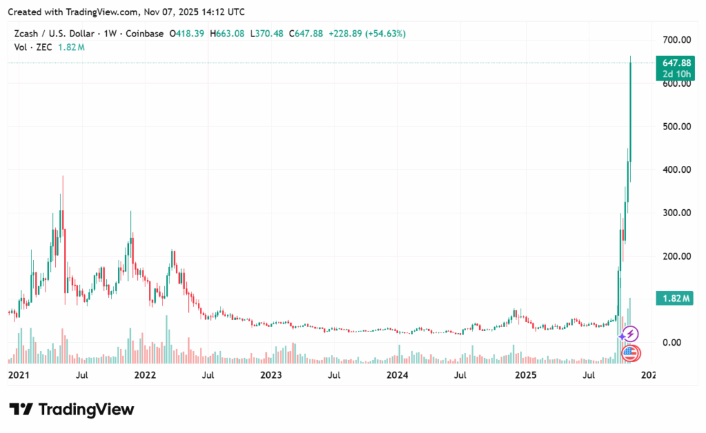 此次暴涨并非昙花一现。Zcash已突破多年沉寂的横盘格局,暗示市场对隐私币的投资情绪可能发生根本性转变。周线图上陡峭的上升曲线凸显买盘决心,表明隐私类资产正重获市场信心。