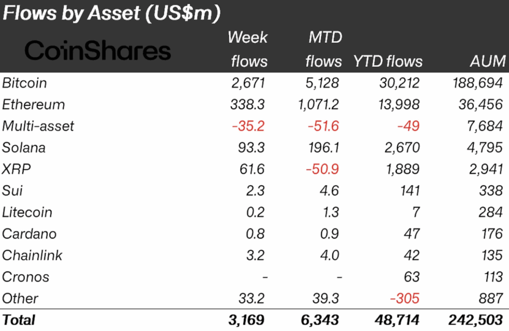 Solana、XRP、BTC和ETH资金流入 | 数据来源:CoinShares