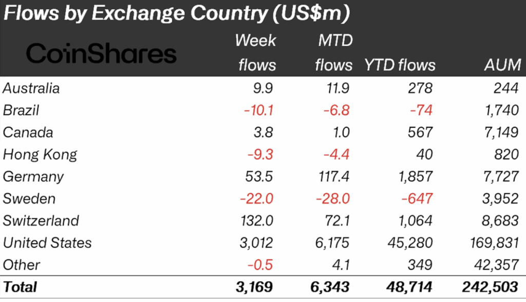 各国加密货币市场资金流向 | 数据来源:CoinShares