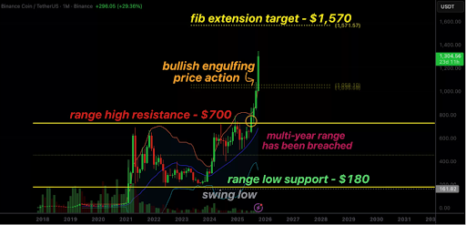 币安币(BNB)持续呈现高点与低点同步上移的经典看涨形态,各时间维度的市场结构均彰显牛市特征。突破多年震荡区间后,该加密货币持续创下历史新高,配合强劲的交易量确认了市场买盘的活跃度。在机构资金持续流入的支撑下,1570美元斐波那契扩展位成为关键技术目标位。