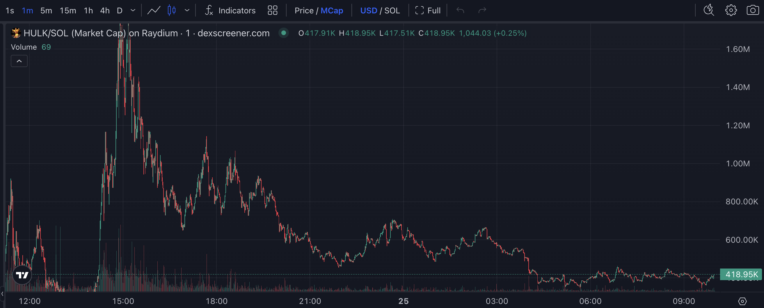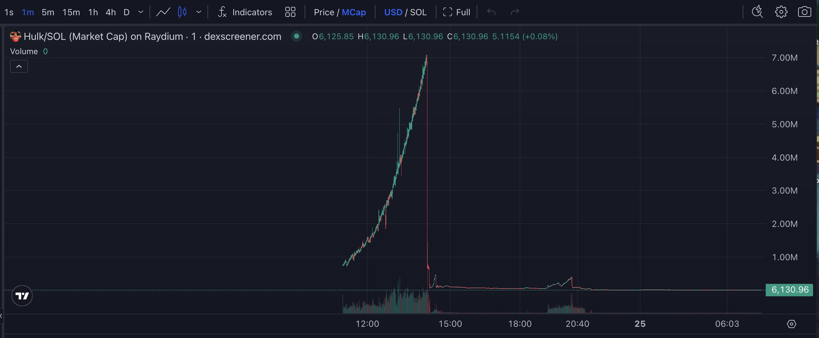 图表显示这个HULK代币最终同样崩盘,但其市场表现与新型骗局截然不同。吊诡的是,去年这个卷款项目竟比24小时内新诞生的资产显得"诚实"许多——虽然峰值市值仅为七分之一,但缓慢下跌过程中多次出现"死猫反弹",为投资者提供了套利机会。