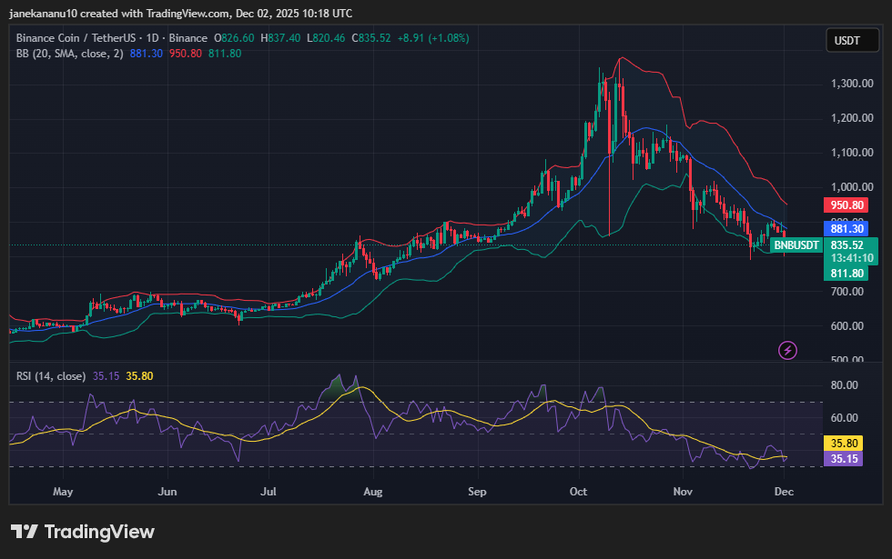 截至2025年12月2日,币安币(BNB)交易价为835.52美元,较近期1360美元的历史高点下跌41%。当前价格已跌破20日简单移动平均线(881.30美元)及布林带上轨(950.80美元),而布林带下轨811.80美元构成短期支撑。