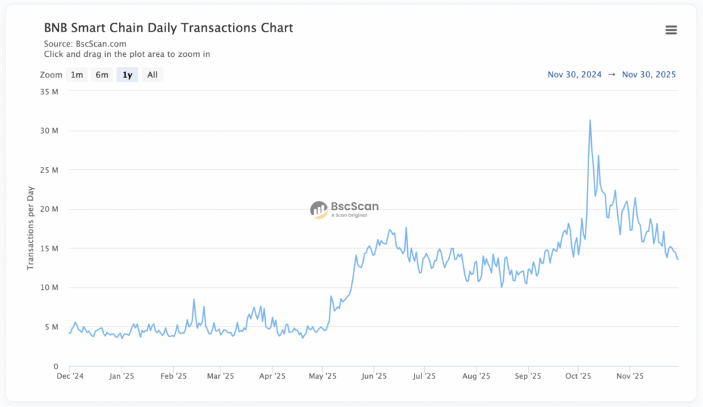 BNB链上活动显著放缓。每日交易量从10月8日的3130万笔峰值下降至12月2日的1350万笔,不足两月内跌幅达57%。