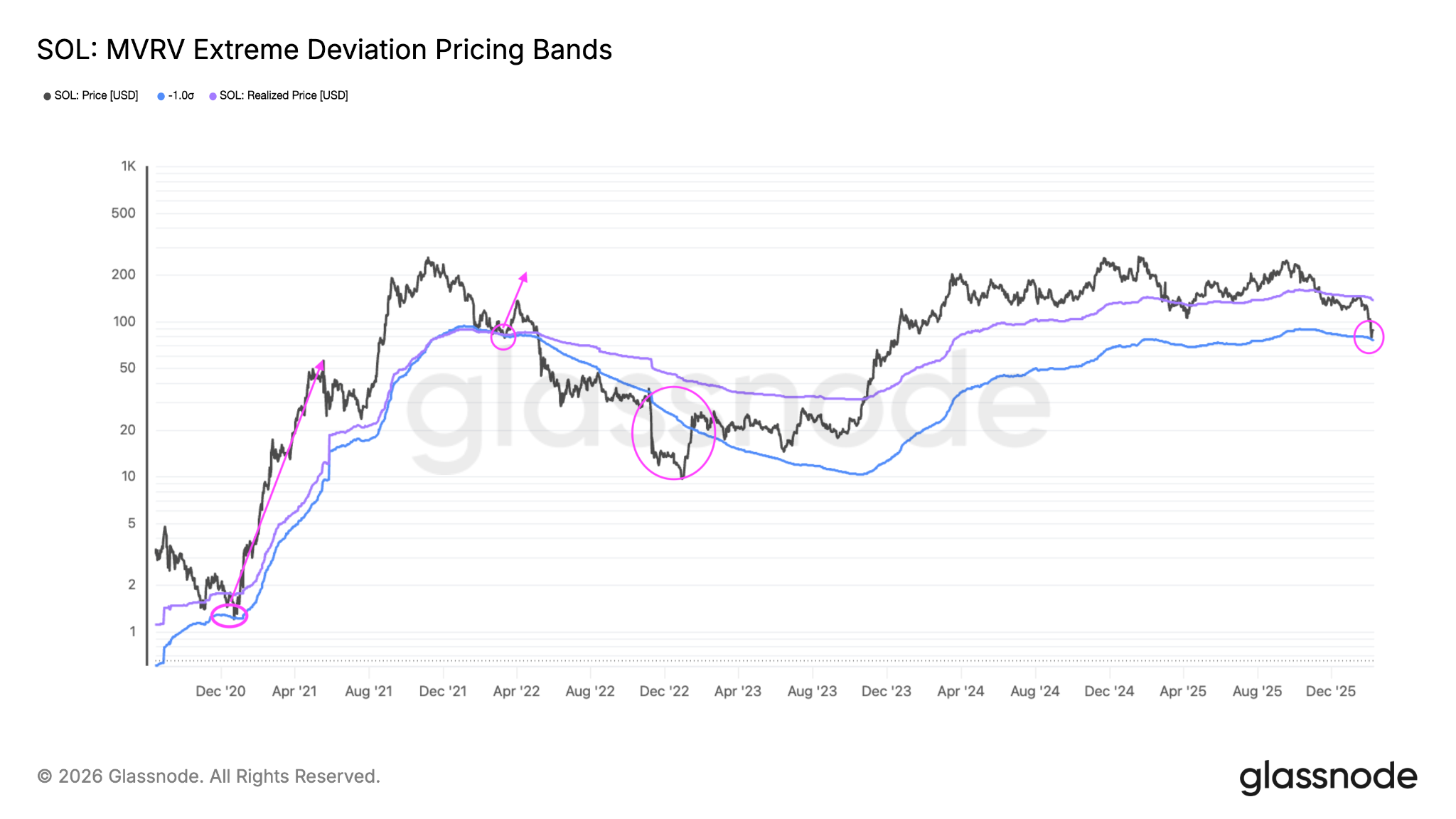 历史数据表明,SOL价格通常在触底前跌至MVRV最低波段附近甚至下方。例如2022年3月的反弹中,SOL在测试75美元附近的MVRV最低偏差波段后,三周内上涨87%至140美元。类似反弹早在2020年12月也曾出现。