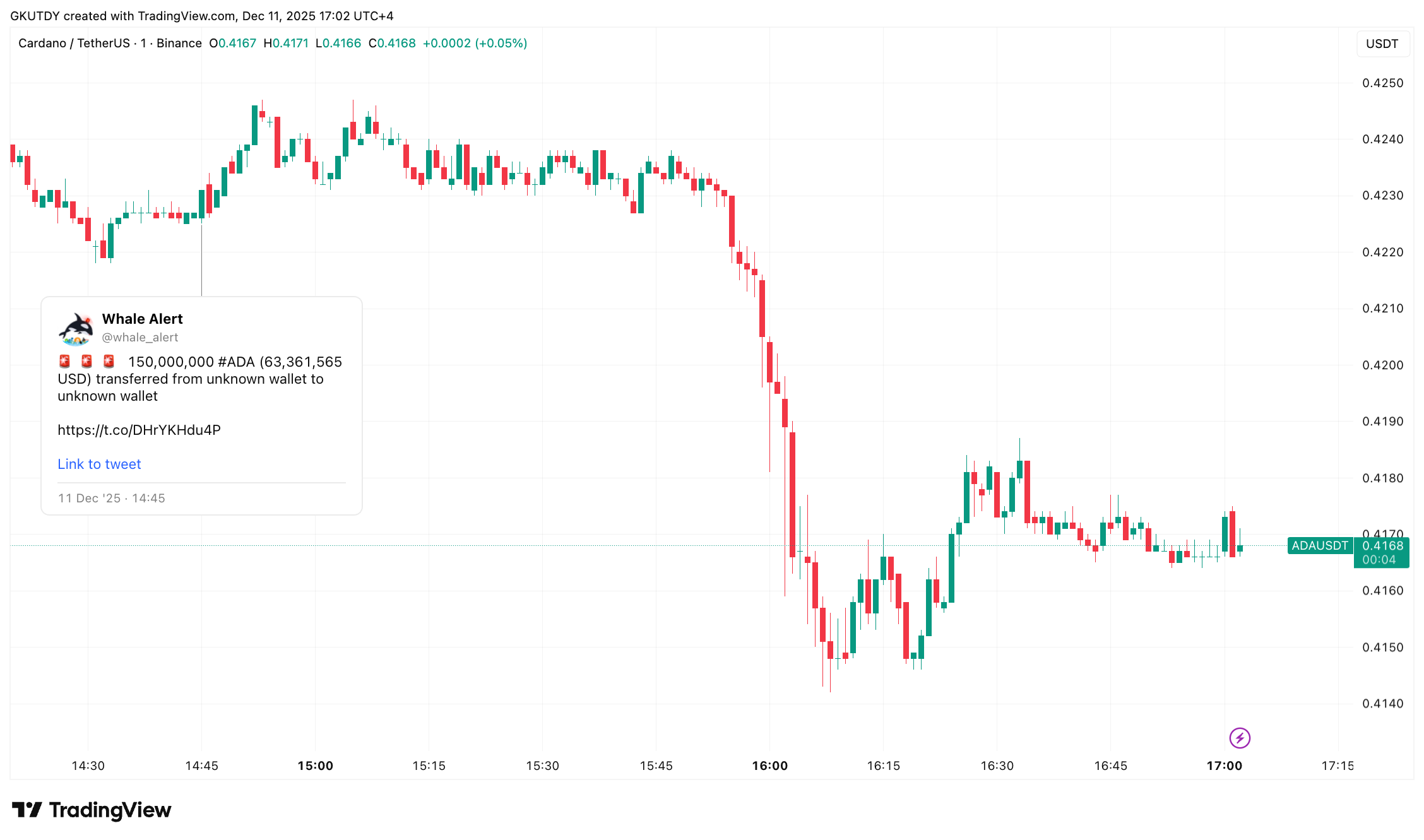 据鲸鱼警报报道,卡尔达诺在周三的交易时段遭遇波动,原因是两个未知钱包之间转移了1.5亿枚ADA(约合6330万美元)。市场关注到这笔交易的规模、时机以及它发生在交易清淡时段的特殊性。受此影响,ADA价格在随后15分钟内从约0.421美元跌至0.414美元(短期图表),最终在0.417-0.418美元附近企稳。