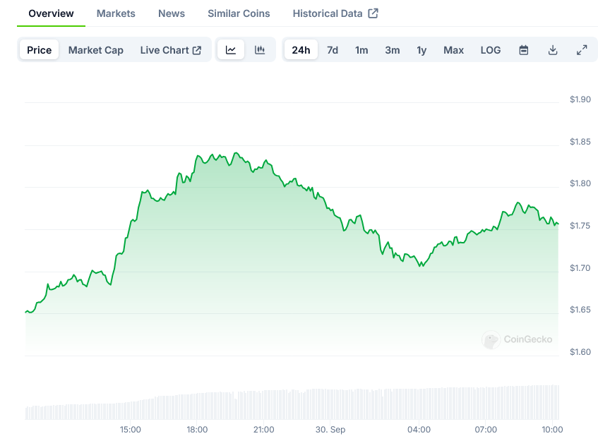 最新数据显示,Sui当前价格为1.83美元,过去24小时内上涨10%。这一上涨是更大上升趋势的一部分,过去一周内涨幅达15%,而过去一个月的涨幅更是高达125%。