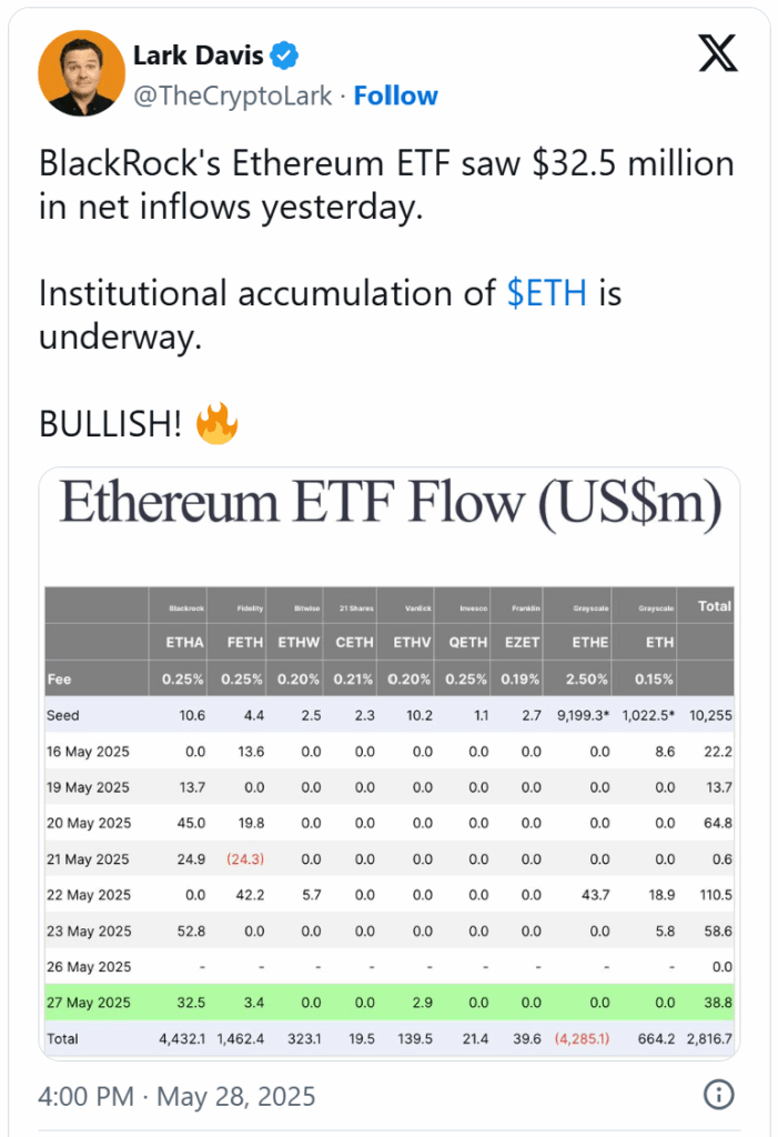 本周二贝莱德斥资3250万美元购入ETH,同日富达基金也以340万美元建仓,推动当日以太坊ETF总流入达3880万美元。