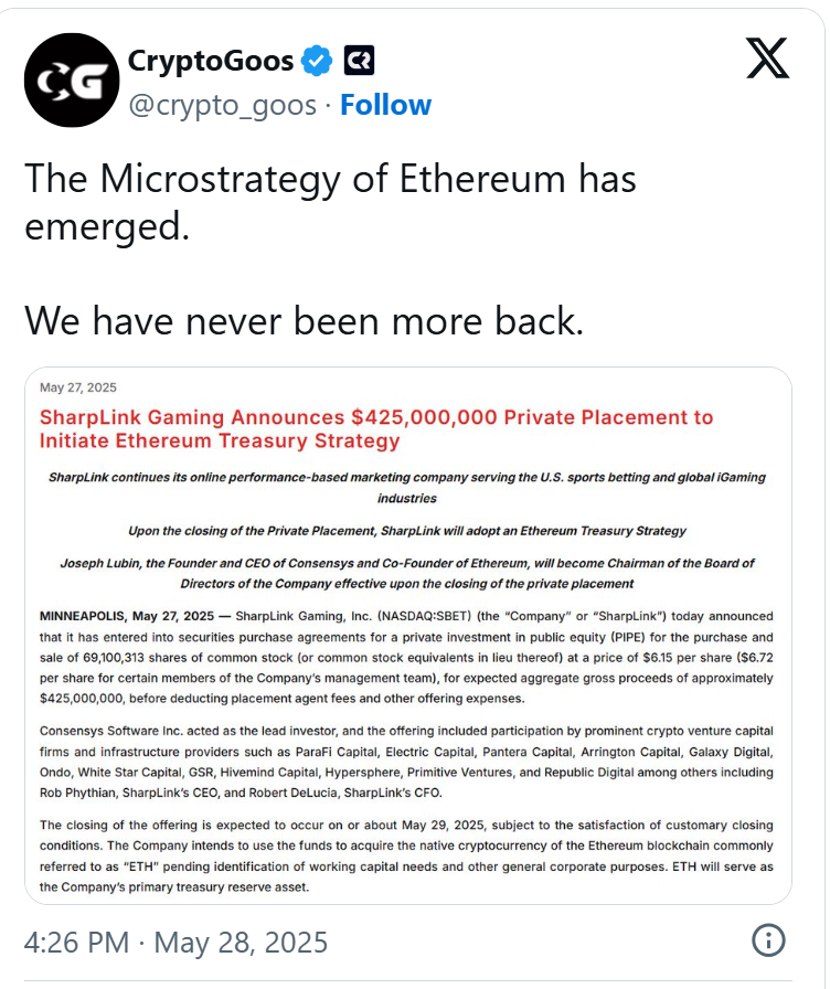 纳斯达克上市公司SharpLink Gaming近日宣布将进行4.25亿美元私募融资,计划建立首个以太坊储备金库。