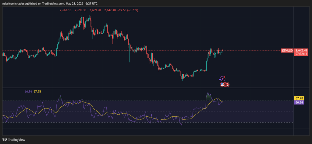 ETH价格在5月第二周冲高至2739美元后陷入盘整,当前交投于2637美元附近。相对强弱指数(RSI)即将突破均线,暗示新一波上涨动能正在酝酿。