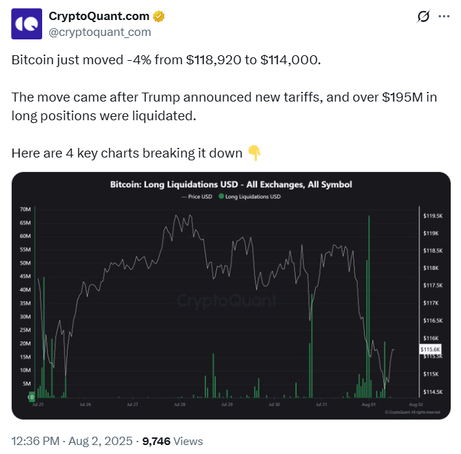 周五比特币价格从118,920美元跌至114,000美元,此前特朗普政府宣布新一轮进口关税。
