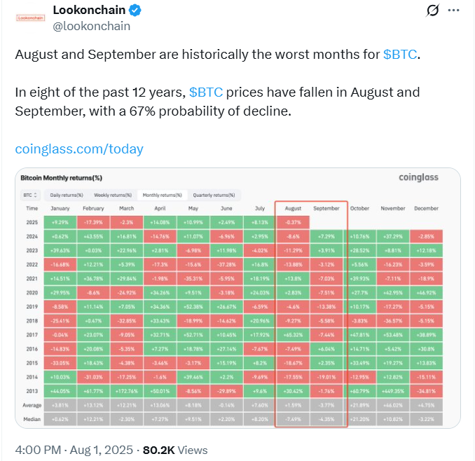 值得关注的是,比特币往往在每年此时表现疲软。过去12年中有8年,比特币价格在8月和9月均出现下跌,当前走势符合这种季节性规律。