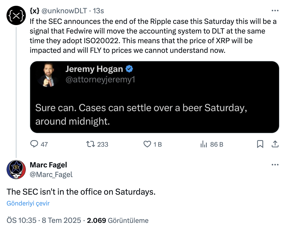 部分专家认为,潜在和解可能配合美联储计划于7月14日推出的分布式账本技术及ISO 20022标准转换。化名Jazzy Q的评论员指出,若所有模块在同一周内激活,XRP或将在新支付基础设施中扮演关键角色,其价格可能攀升至"难以想象的高度"。