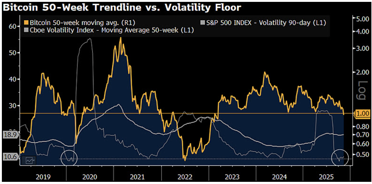 在麦格隆发布的彭博报告中,一张图表对比了比特币50周移动平均线与芝加哥期权交易所波动率指数(VIX)及标普500实际波动率。这两个指标均处于异常低位,但这种平静预计难以持续。麦格隆指出,VIX的50周均值约19点,预示股市"可能逼近"该阈值,暗示市场即将迎来波动。