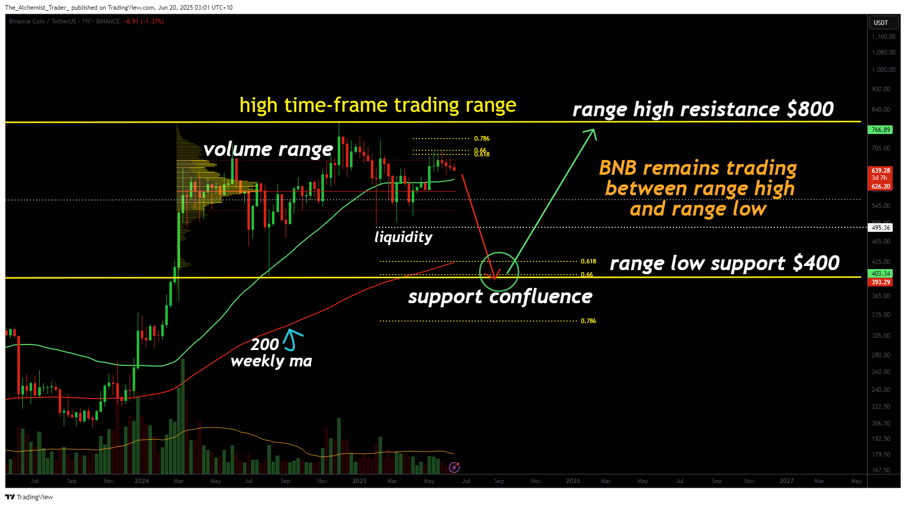 除非BNB突破800美元或失守400美元支撑,否则价格预计将维持区间震荡。交易者应重点关注区间边界:400美元作为理想吸筹区,800美元则是突破触发器。在结构出现明确转变前,区间交易策略仍具优势。
