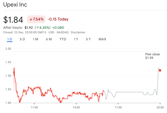 Upexi(UPXI)股价周二收盘下跌7.54%至1.84美元,但盘后出现小幅反弹,上涨4.34%至1.92美元。