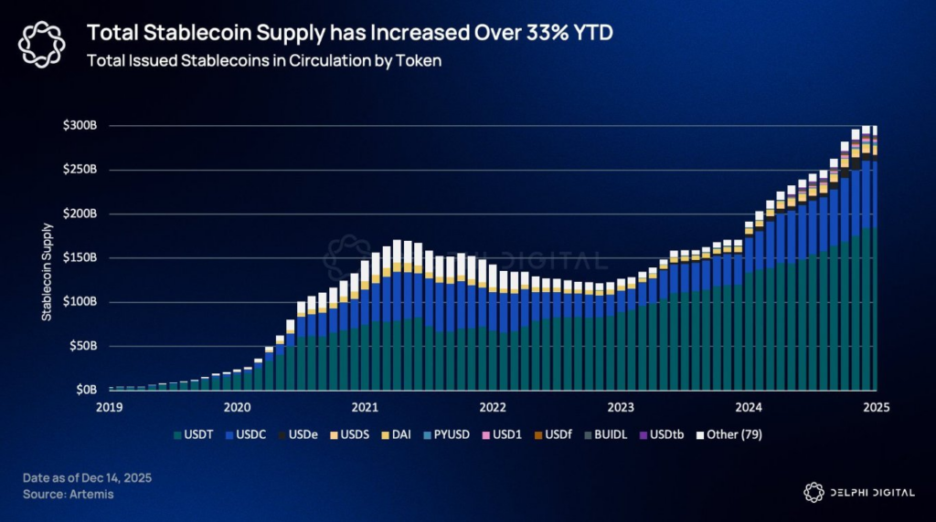 尽管政策层面博弈激烈,稳定币的实际应用仍在持续扩张。最新数据显示,全年稳定币总供应量增幅已超过33%,月均转账额在绝对数值上更是超越Visa。值得注意的是,这些并非仅是交易性流动,而是真实的支付行为体现。