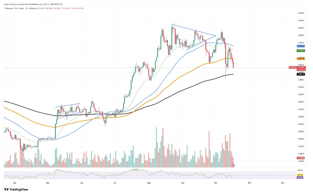 从技术面看,以太坊动能正快速衰减。ETH未能突破4200美元阻力位后急速回落至3730美元附近,更跌破坚守数月的100日均线。当前200日均线(3500美元)成为关键支撑位,若失守,价格滑向3000美元下方将不可避免。