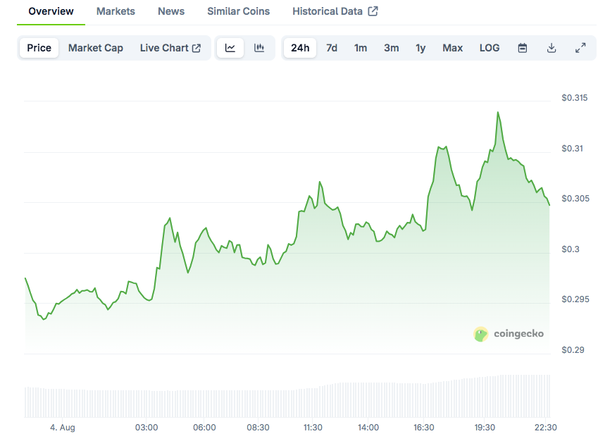 据CoinGecko数据,POPCAT现报0.3053美元,24小时上涨2.67%,周线下跌14.05%。短期回调未改长期趋势。