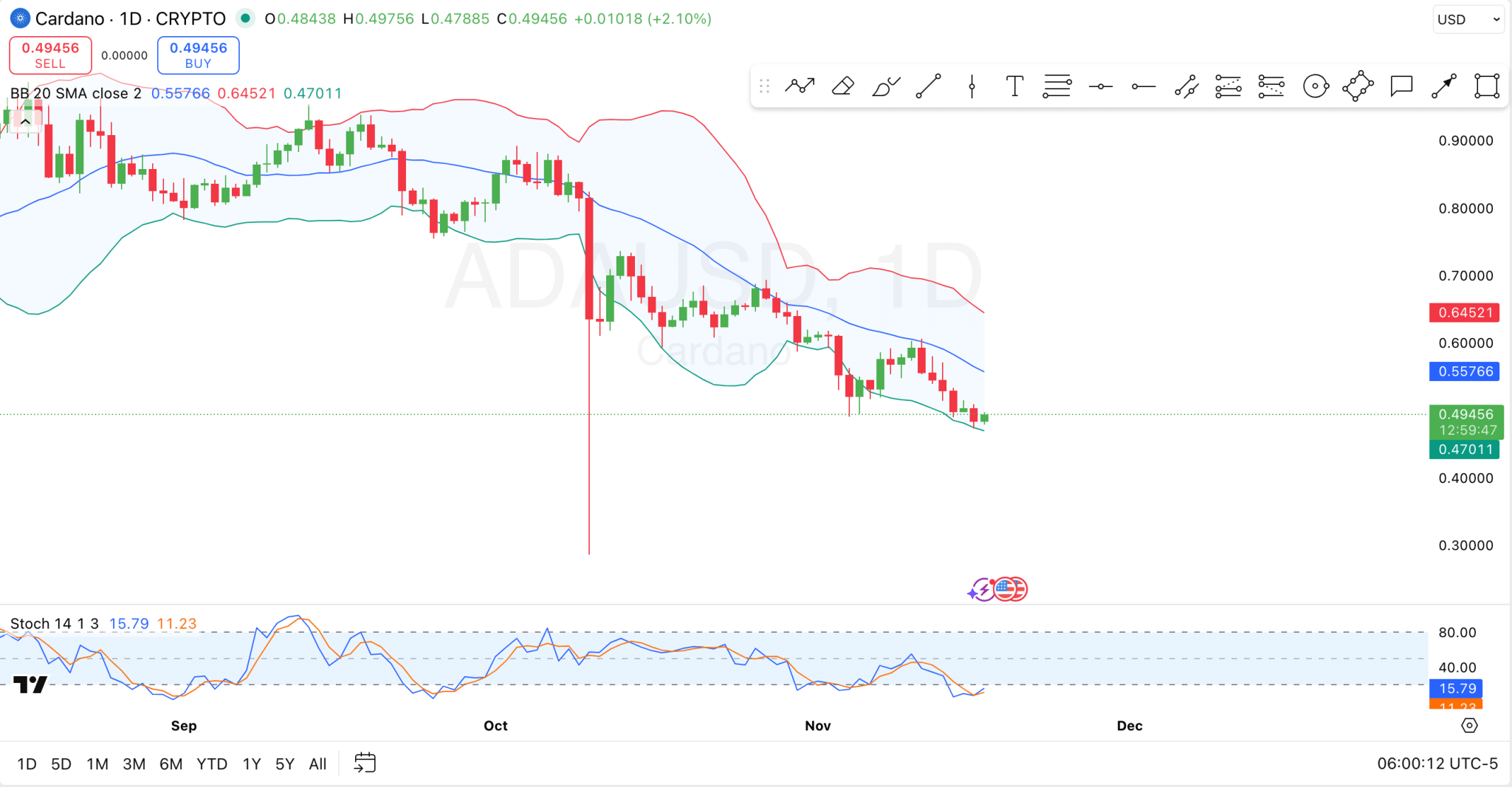 值得注意的是,卡尔达诺(ADA)正面临新一轮下行压力,过去24小时内价格进一步下跌,延续了数周来的跌势。随着看跌情绪笼罩整个加密市场,该代币现已跌破0.50美元心理关口,在投资者信心下降的情况下测试关键支撑位。