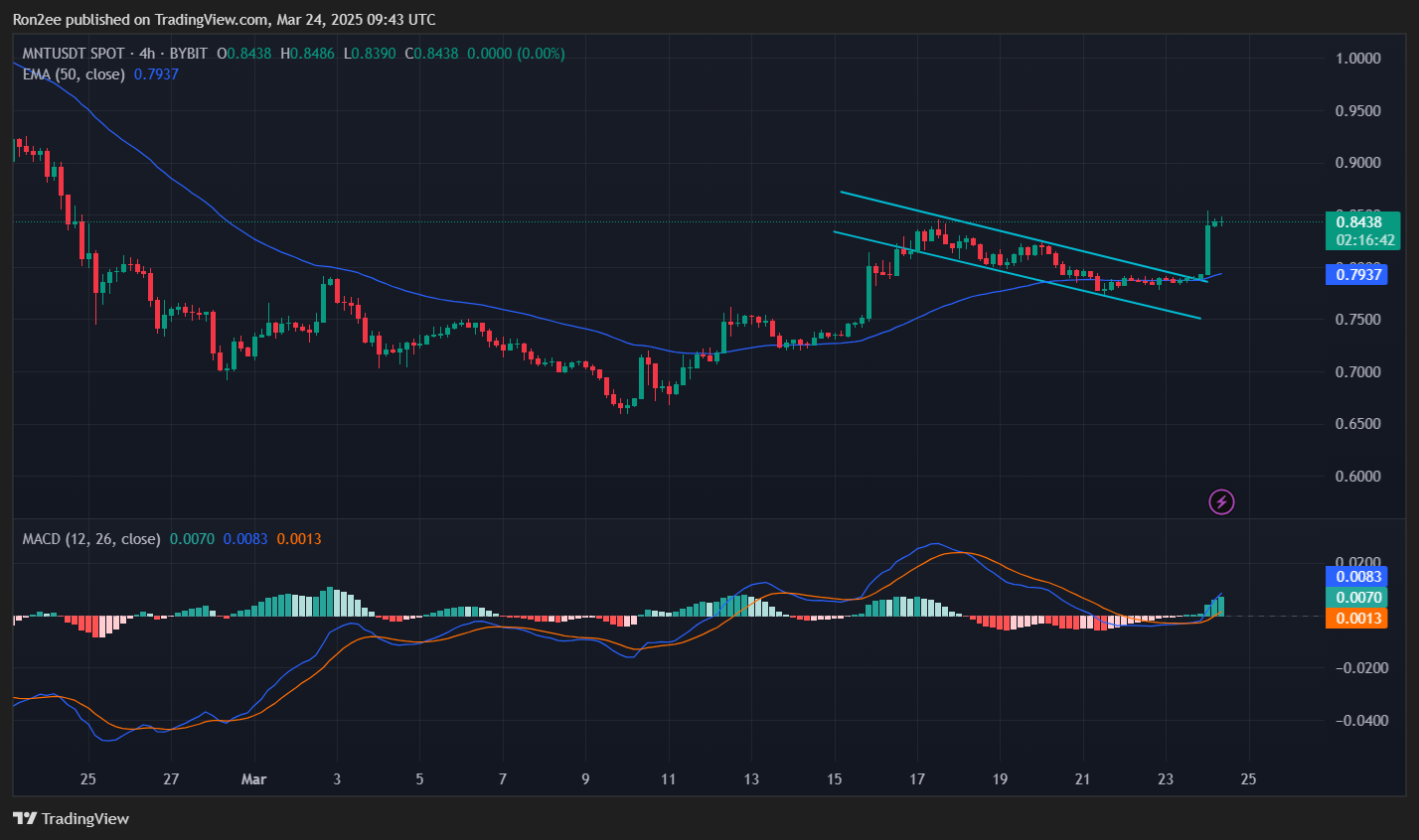在4小时/USDT价格图表上,MNT已经突破了自3月17日以来观察到的下降平行通道模式。这种模式通常预示着持续的上涨。