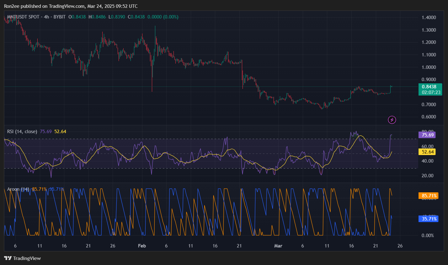 在WLFI购买消息公布后,MNT日内涨幅达8.5%,最高触及0.849美元,市值突破28.3亿美元。交易量也大幅飙升66%,达到约1.23亿美元,显示出投资者对该代币的兴趣重新升温。
