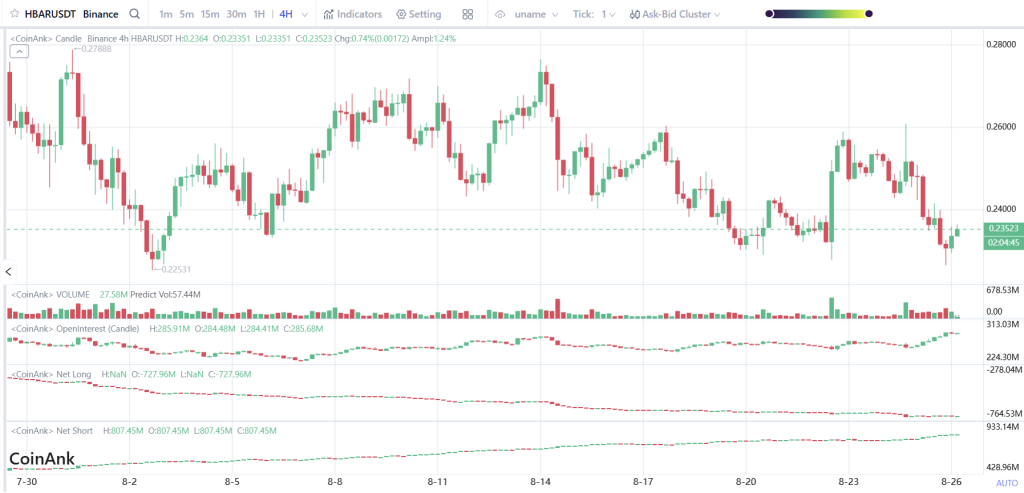 当前HBAR处于关键博弈阶段:空头持仓高企、成交量低迷、未平仓合约缓步攀升,这种组合往往孕育突破行情。核心在于多头能否把握时机反攻。建议重点关注0.232美元支撑位及0.245美元多头反攻触发点。