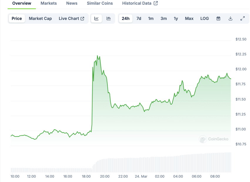 特朗普总统发布声明时,TRUMP代币价格升至12.25美元,随后回落至12美元,但整体日表现依然强劲。特朗普使用社交媒体渠道后,该代币立即出现价格飙升。数字货币交易者和投资者迅速察觉到这一显著的价格波动,引发了更多在线讨论。