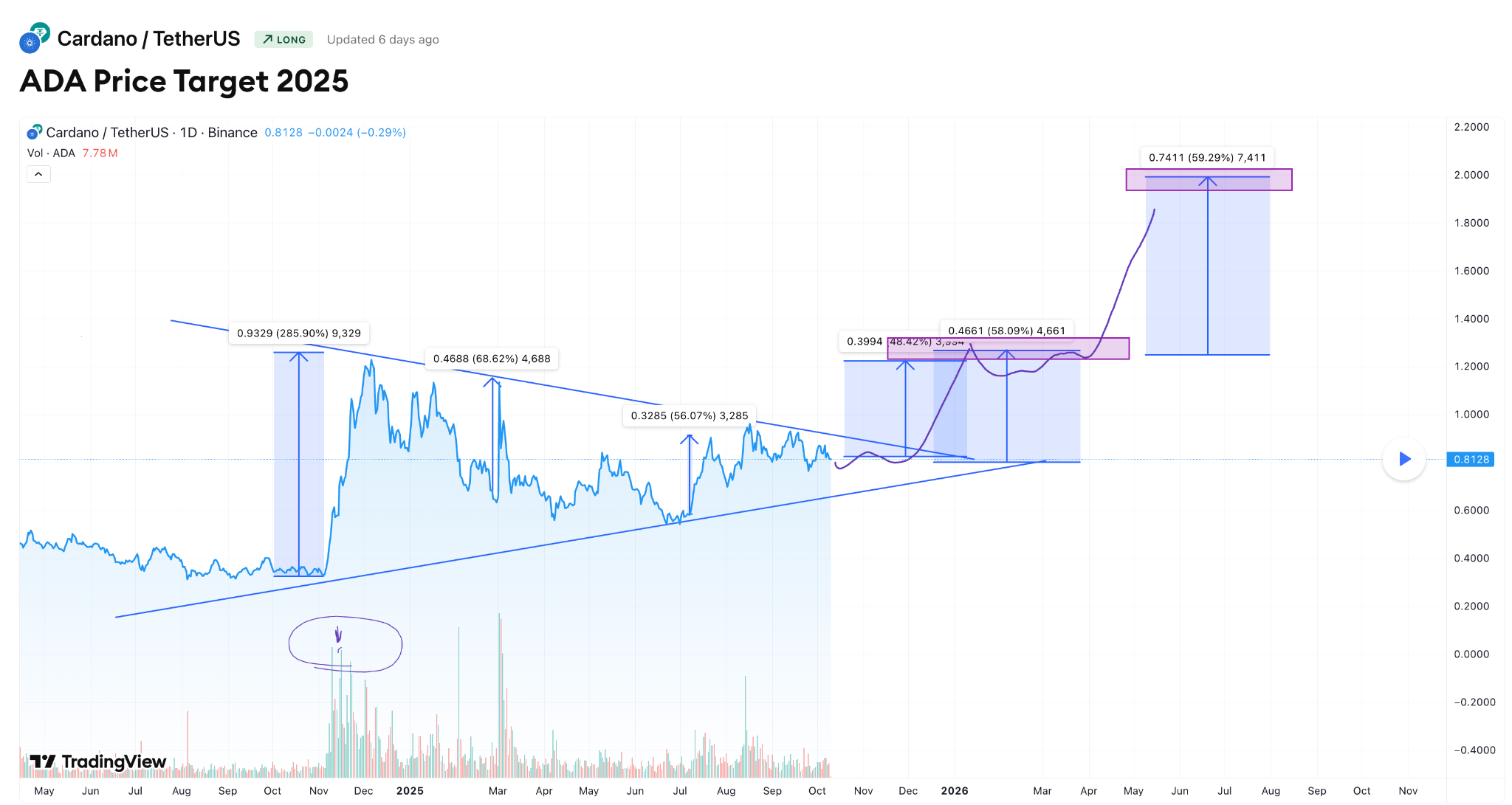 另一位分析师BorisCryptoUSA认为,若市场情绪改善,卡尔达诺可能冲击1.20-2.00美元区间。图表显示ADA正在形成对称三角形,一旦大盘企稳或触发向上突破。