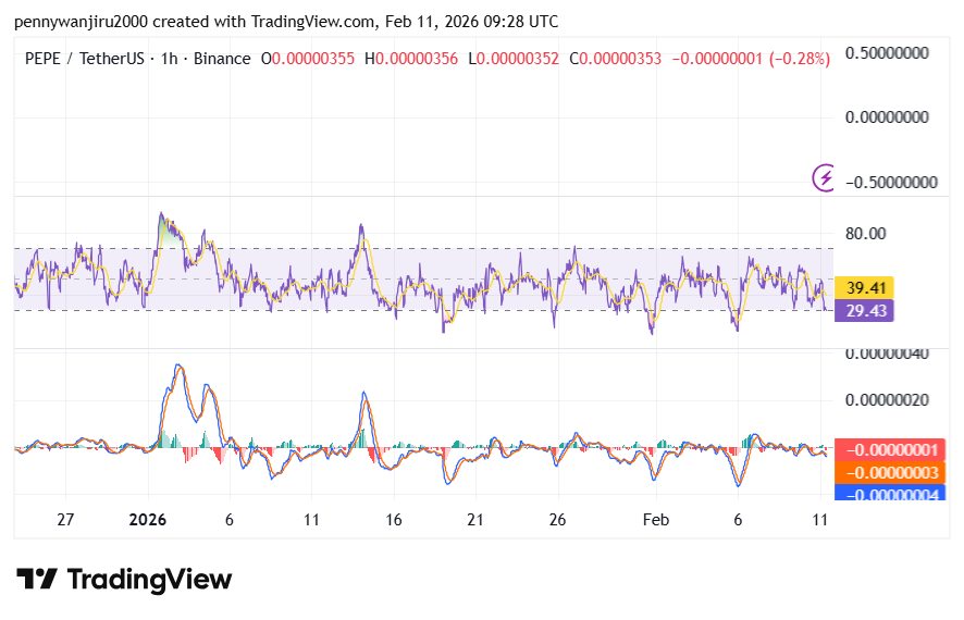 PEPE当前交易价格为0.053554美元,价格波动被压缩在0.053539美元支撑位与0.053705美元阻力位之间。1小时RSI接近40.30,MACD呈现负值,表明短期上行力量有限。尽管美元计价下跌3.1%,PEPE兑BTC与ETH却分别上涨0.5%,显示其在加密货币配对中的相对强势。