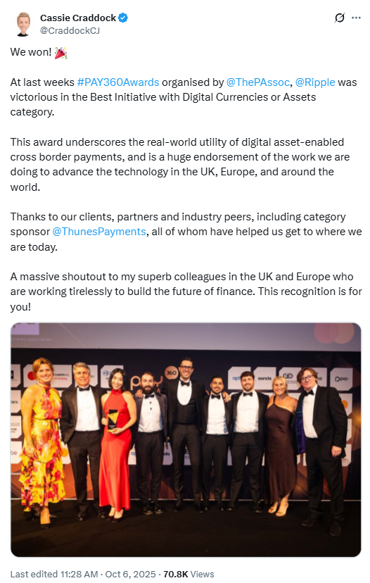 在另一则利好消息中,Ripple于PAY360颁奖礼斩获"最佳数字货币/资产创新应用"奖项。Ripple英国CEO兼欧洲董事总经理Cassie Craddock强调,该奖项彰显了公司在实现数字资产跨境支付实际应用方面的努力,同时凸显了按需流动性(ODL)方案的价值。Ripple获奖动态 | 来源:Cassie Craddock