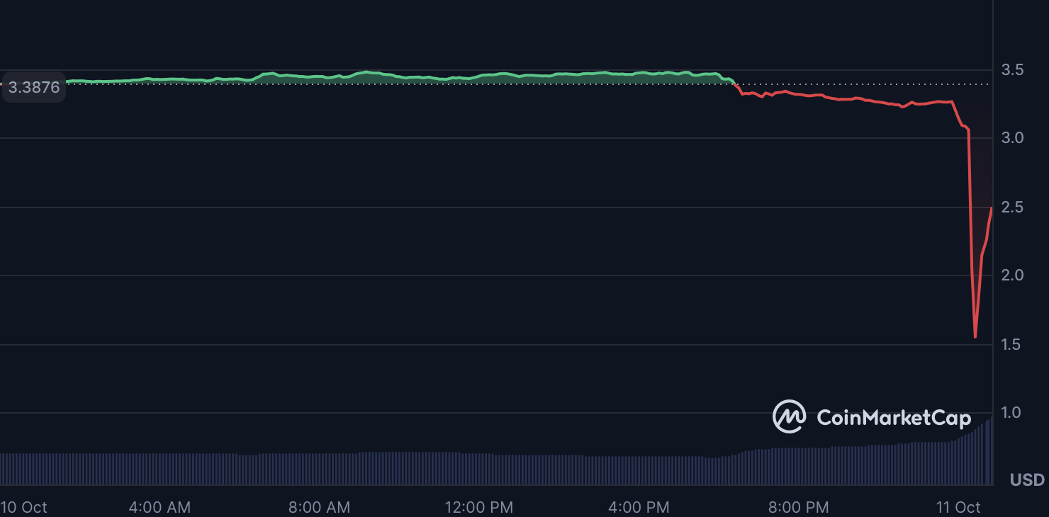 在周五加密货币市场全面抛售中,Sui(SUI)价格急剧下挫至2.48美元,跌幅达26.9%。该代币曾短暂崩跌至1.60美元附近,随后迅速反弹,这种剧烈波动与特朗普总统宣布对中国商品征收100%关税后整个市场的混乱走势如出一辙。