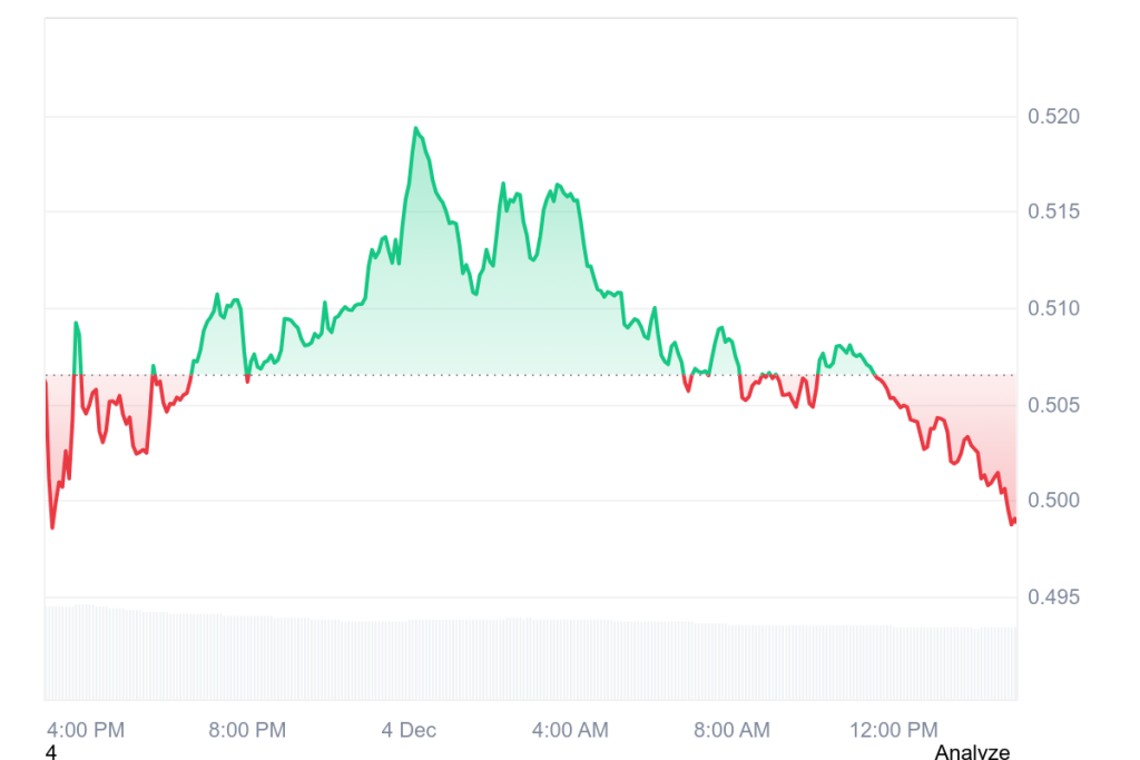 ONDO价格在经历了相当震荡的24小时后,今日回落至0.50美元关口下方。尽管昨夜价格一度强势突破0.515美元,但这一动能未能持续。随着市场进入美国交易时段,卖方力量介入,代币价格逐渐走低。此番波动并非独立事件——作为今年现实世界资产(RWA)赛道中最受瞩目的项目之一,ONDO的下跌引起了市场广泛关注。