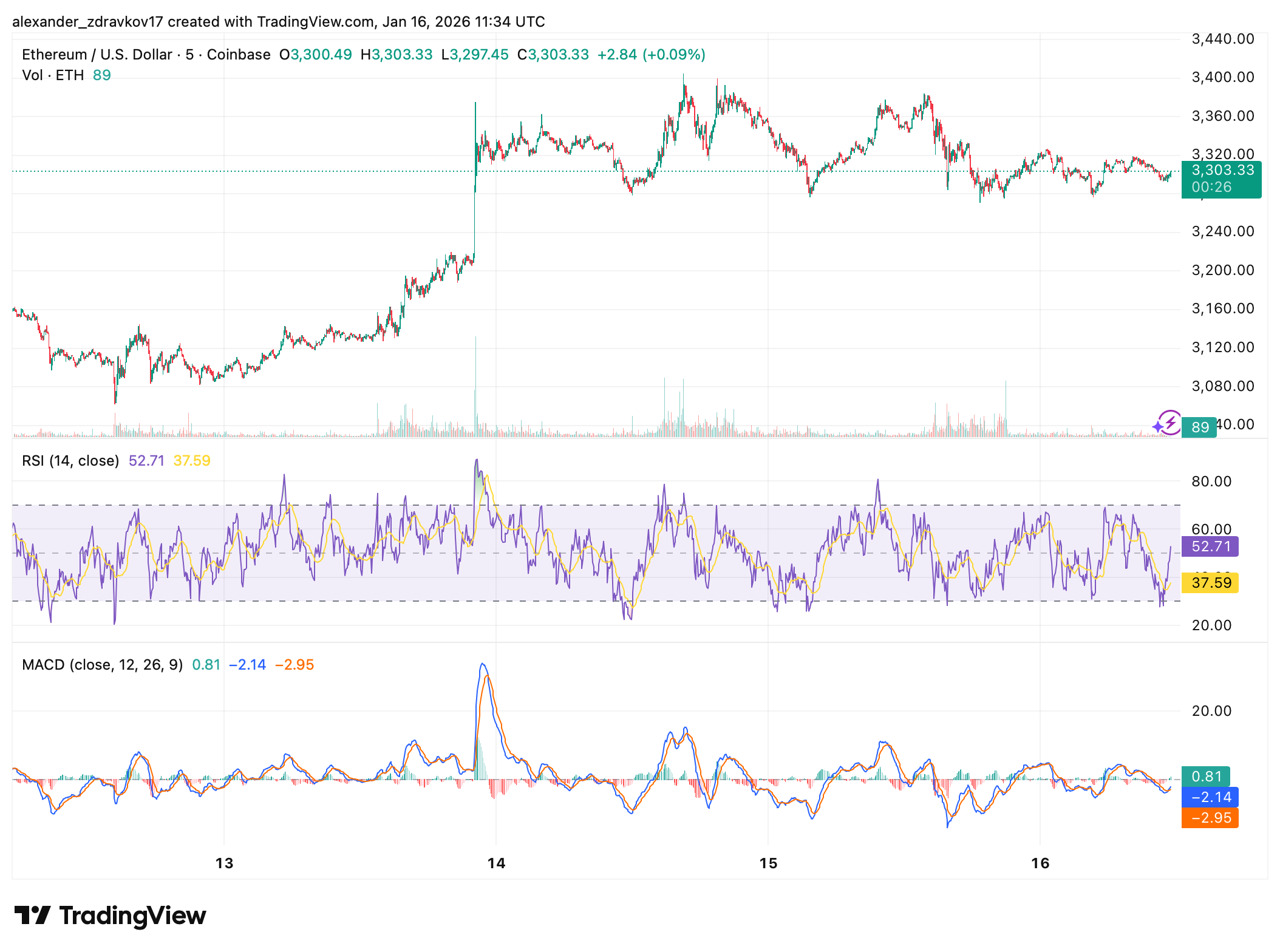 从技术角度看,以太坊在本周初强劲冲高后,目前正围绕3300美元进行窄幅震荡。图表显示价格在强势突破后转入横盘整理,表明市场正在消化近期涨幅而非立即延续上涨趋势。