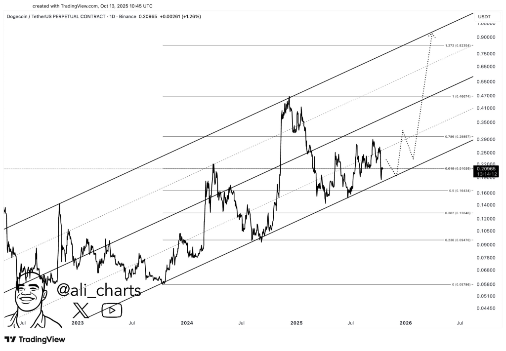 分析师Ali_charts指出,狗狗币在0.16美元关键支撑位上方的稳定表现,可能推动其向0.48美元反弹。只要价格维持在该水平之上,狗狗币将获得显著上行动能。若0.16美元支撑有效,价格或快速攀升至0.48美元。