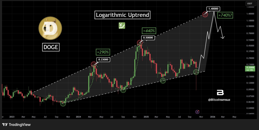 若价格触及通道上轨,狗狗币可能实现740%的涨幅,达到1.40美元。历史数据支持这一看涨预期:此前该加密货币曾实现290%涨幅(至0.23美元)和440%涨幅(至0.50美元)。分析师同时强调,该预测的实现需以比特币($BTC)保持整体上涨趋势为前提。
