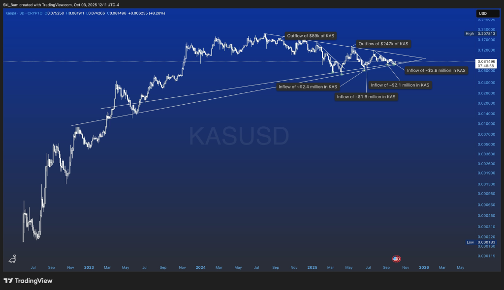 @SkiBumTrading分享的链上图表显示,过去几个月出现多笔巨额资金流入——分别价值约380万、240万和210万美元的KAS——每次价格下跌都伴随强劲买盘。当前Kaspa报价0.0815美元,周涨幅超8%,图表显示其已突破长期整理楔形。若趋势延续,可能预示市场正在为新一轮上涨蓄力——或许就在万众期待的Binance上线前夕。