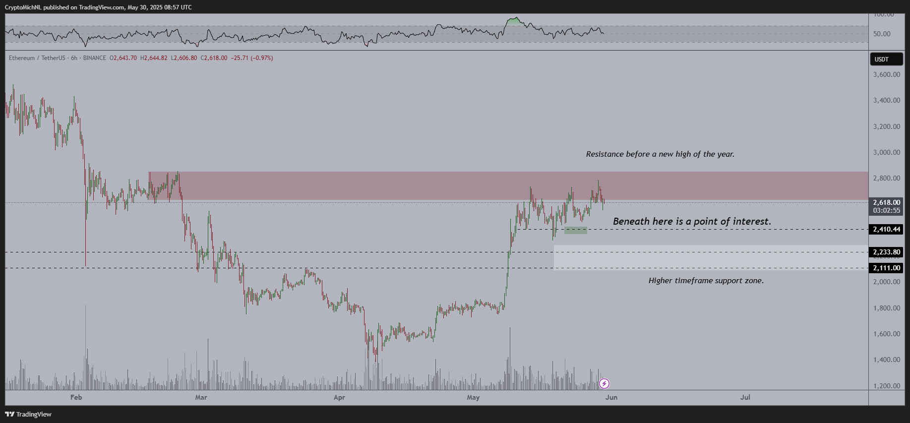 分析师波普强调应重点关注ETH图表:"ETH虽短暂突破2,700美元但迅速回落。这不是关键价位,真正的重点在于其正在为重大突破蓄力。突破时机何在?2,850美元上方存在流动性,且酝酿时间越长,突破力度将越强劲。"